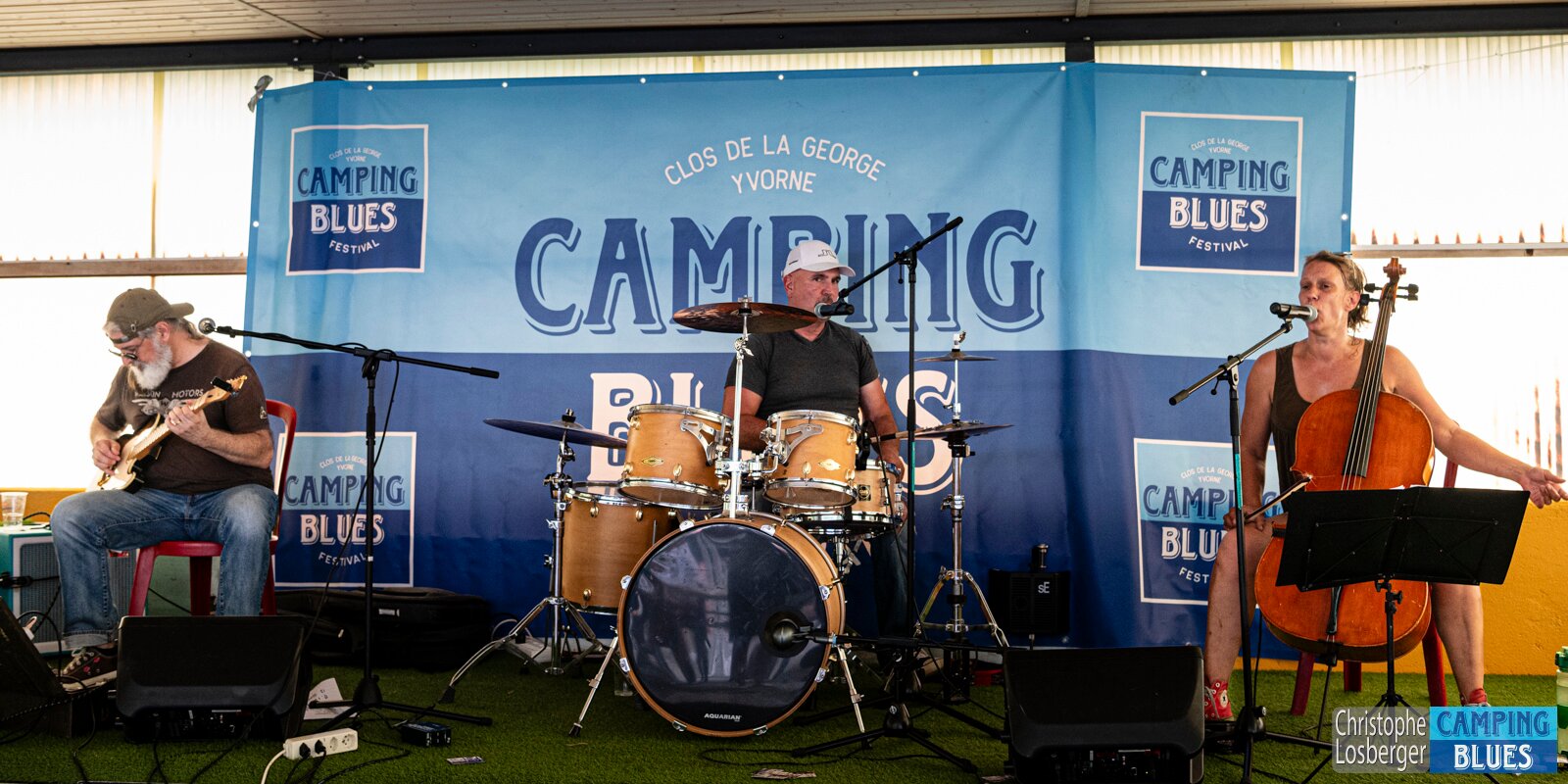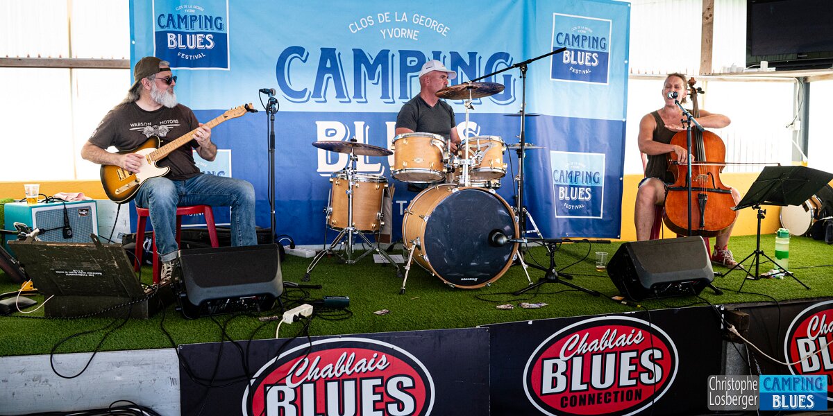 Heike Wyler (cello, vocals), Eric Dubauloz (drums), Marco Becherraz (guitar). Wet Rugs @ Camping Blues Festival, Clos de la George, Yvorne (VD), Switzerland,…