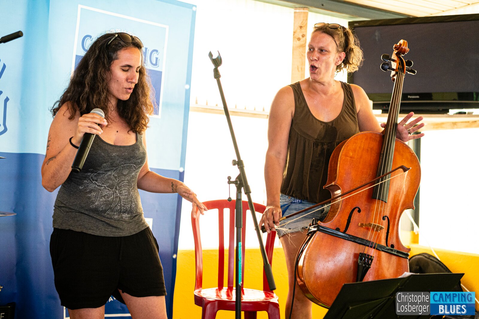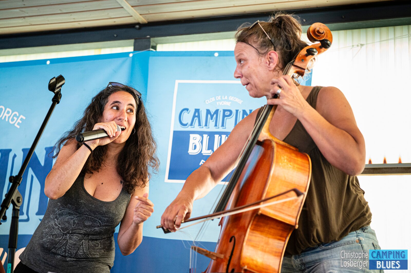 Heike Wyler (cello, vocals), Zazou Haifa (vocals, guest). Wet Rugs @ Camping Blues Festival, Clos de la George, Yvorne (VD), Switzerland, 21.06.2025. .(c)…
