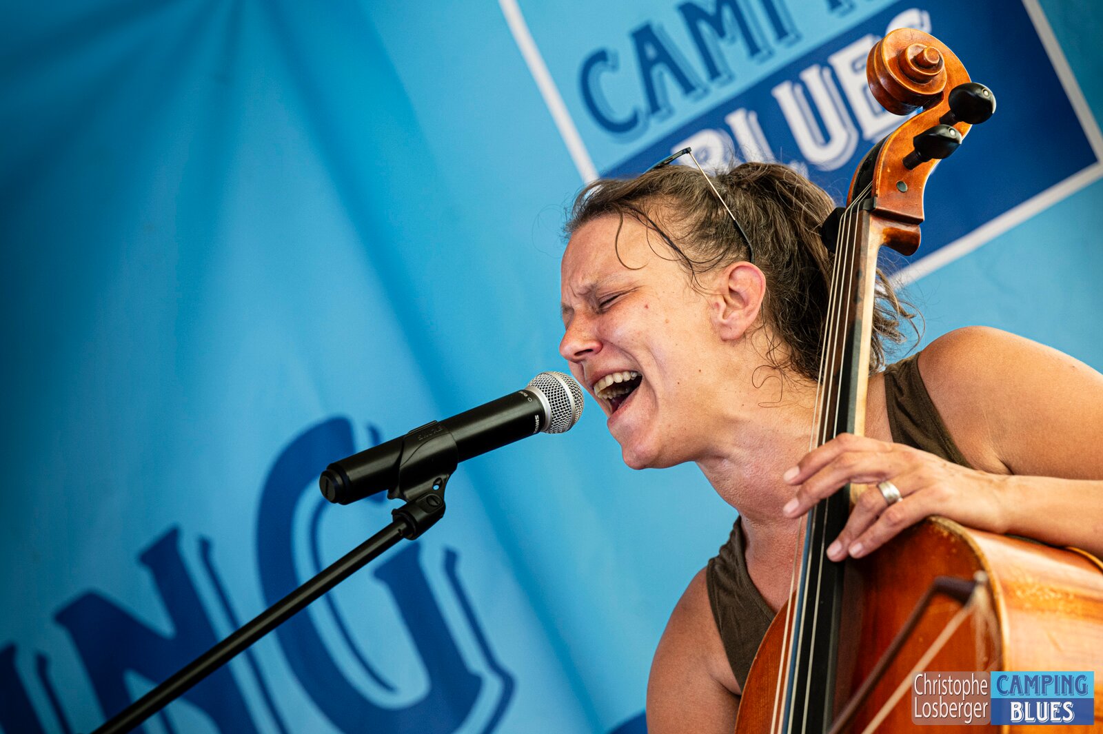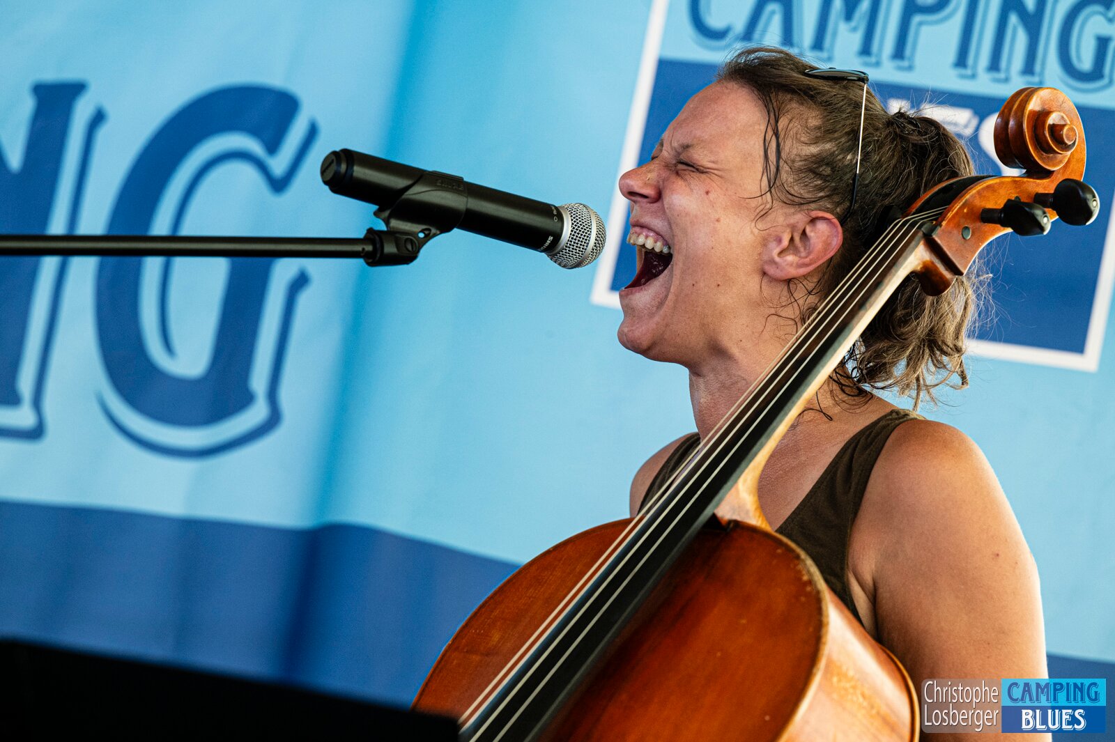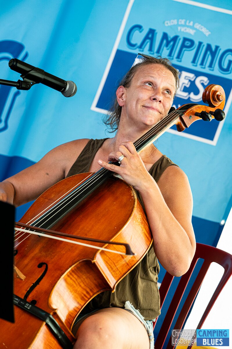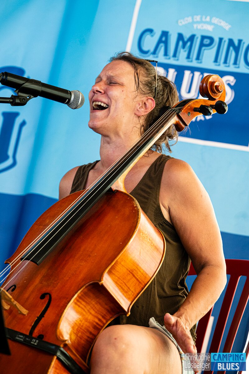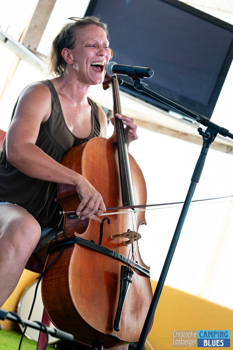 Heike Wyler (cello, vocals). Wet Rugs @ Camping Blues Festival, Clos de la George, Yvorne (VD), Switzerland, 21.06.2025. .(c) Christophe Losberger